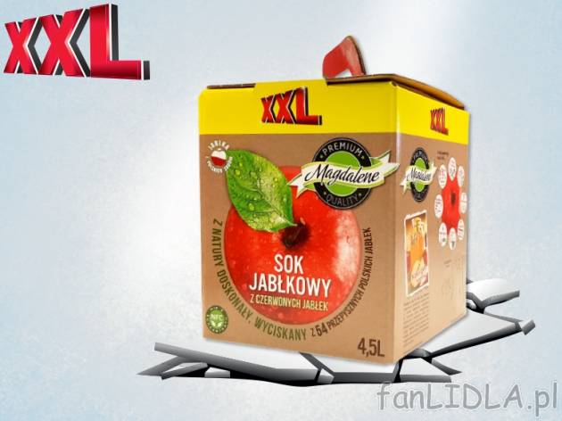 Magdalene Sok jabłkowy Lidl, cena 14,00 PLN za 4,5 l/1 opak., 1 l=3,33 PLN.