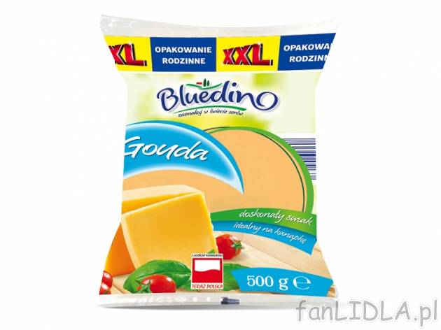 Bluedino Gouda w kawałku Lidl, cena 7,00 PLN za 500 g/1 opak., 1 kg=14,98 PLN.